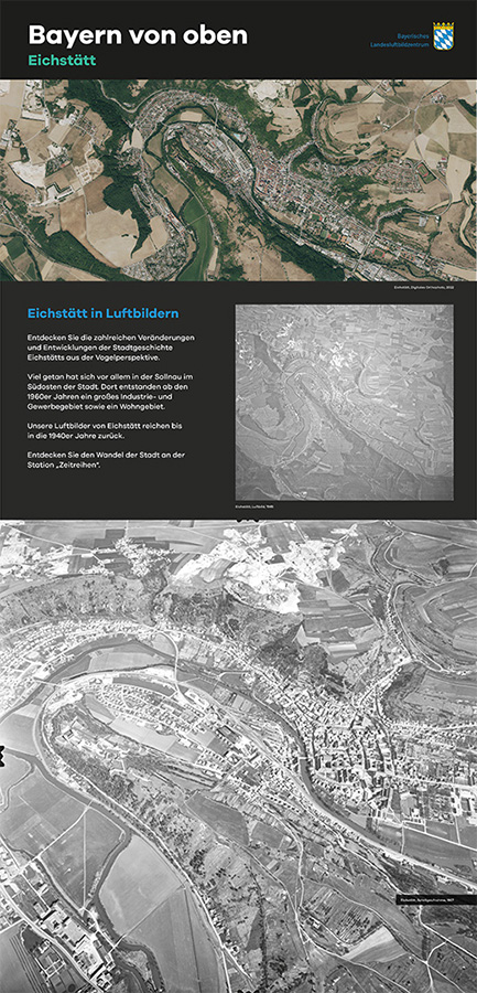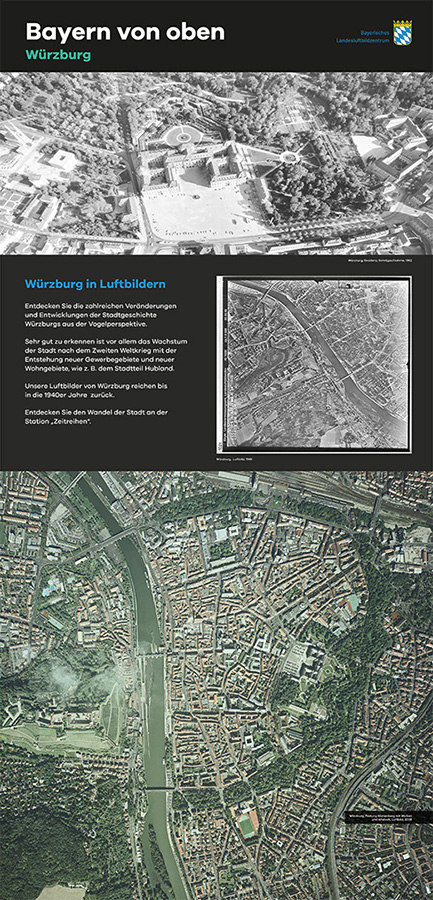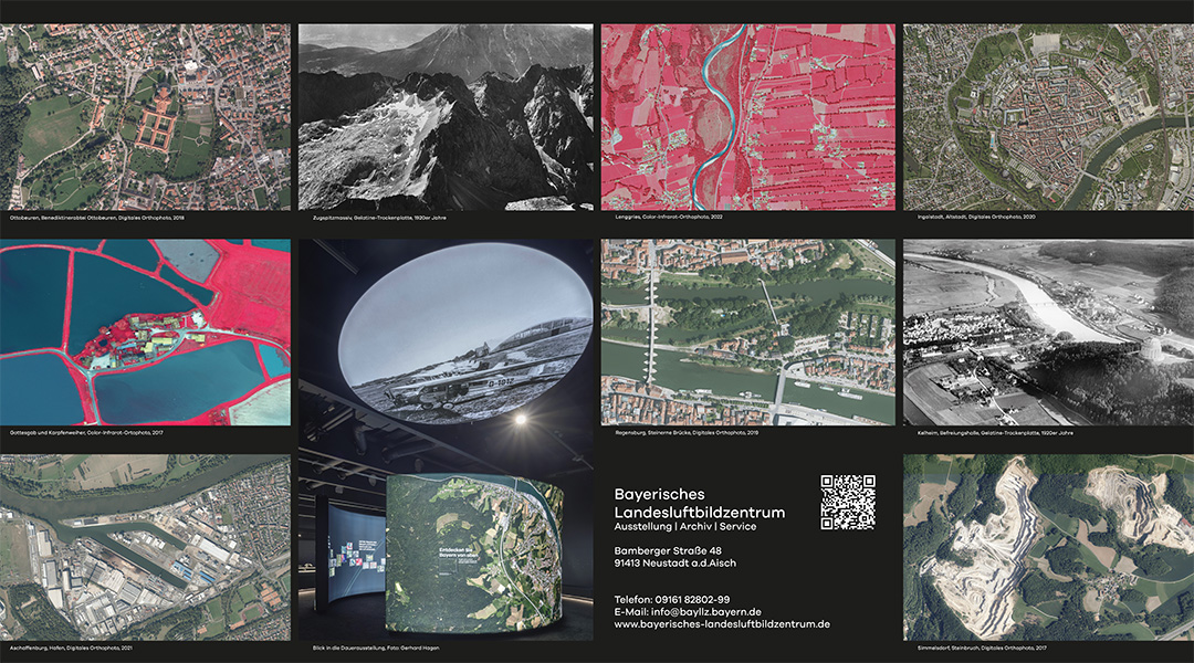 Anlässlich des fünfjährigen Bestehens des Bayerischen Landesluftbildzentrums stellte die Wanderausstellung dessen Angebote einem breiten Publikum vor. Die multimedial gestaltete und leicht verständlich aufbereitete Ausstellung vermittelt einen spannenden Einblick in die Geschichte und Technik der Luftbildfotografie. Auf 14 Ausstellungstafeln wurde den Besucherinnen und Besuchern gezeigt, wie Luftbilder gemacht werden, wie sie aufbereitet werden und wo sie eingesetzt werden.